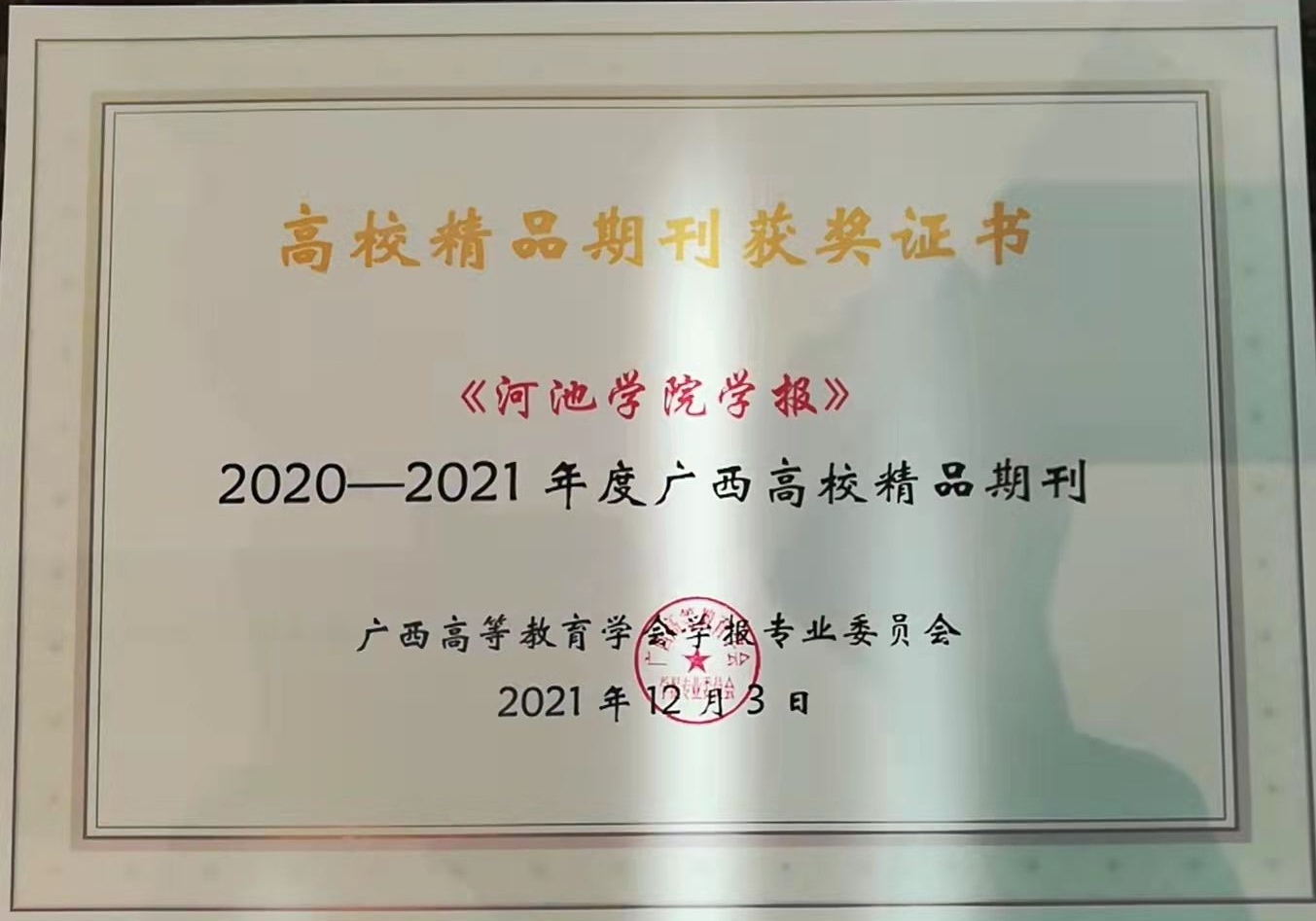 123日,广西高等教育学会学报专业委员会2021年学术研讨会暨评优表彰大会在桂林全州举行。在本次年度评优活动中,我校学报被评为“2020-2021年度广西高校精品期刊”,学报副主编席战强编审被评为“广西高校学报优秀主编”,学报编辑韦杨波、韦志巧两位同志被评为“广西高校学报优秀编辑”。广西高校学报评奖活动每两年一次,这是我校学报自2018年以来连续两次获评广西高校精品期刊