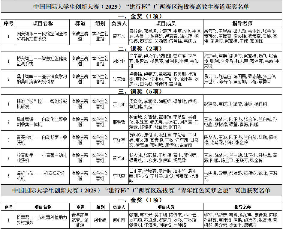 近日,中国国际大学生创新大赛(2025)“建行杯”广西赛区选拔赛获奖名单公布,我校项目团队荣获区赛金奖2项,银奖2项,铜奖5项。