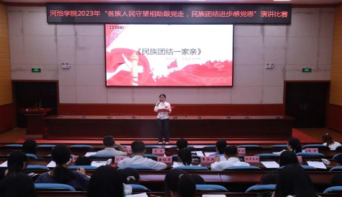 4月19日,为深入推进广大青年筑牢中华民族共同体意识教育,教育引导广大青年牢固树立正确的国家观、历史观、民族观,由共青团河池学院委员会主办的河池学院2023年“各族人民守望相助跟党走,民族团结进步感党恩”演讲比赛在弘毅楼1-205顺利举行。