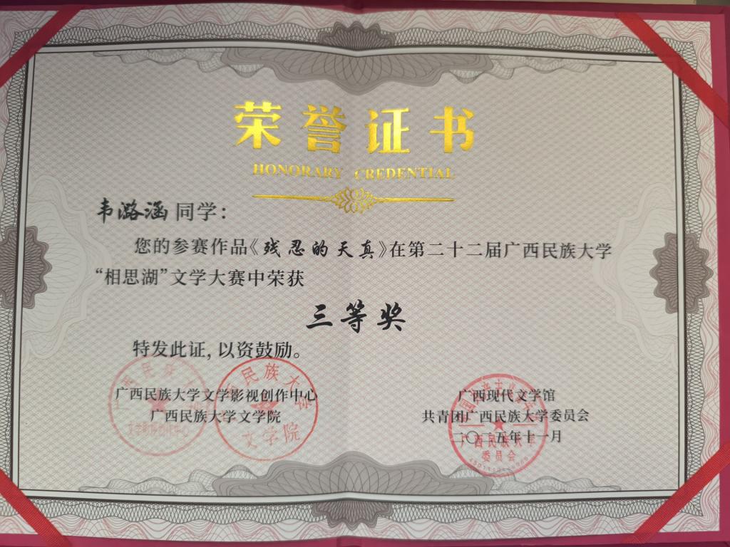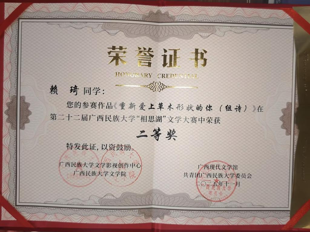 【社团风采】喜讯!我校白云诗社社员赖琦、韦潞涵两位同学在第二十二届广西民族大学“相思湖”文学大赛中荣获佳绩