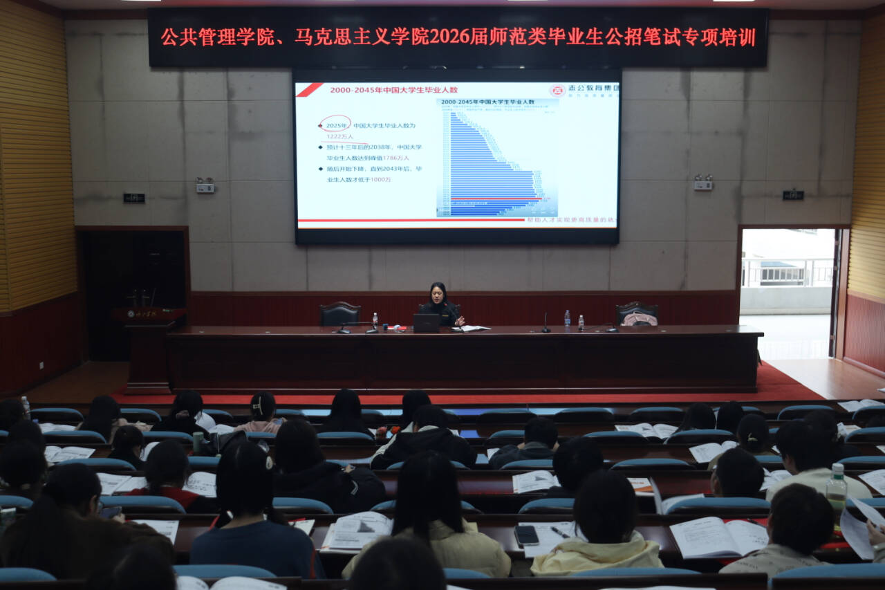 为切实助力2026届思想政治教育专业毕业生备考,1月12日,马克思主义学院邀请校外专家谈婷,于弘毅楼1-205教室举办教师公招笔试专项培训,在校毕业生参训。