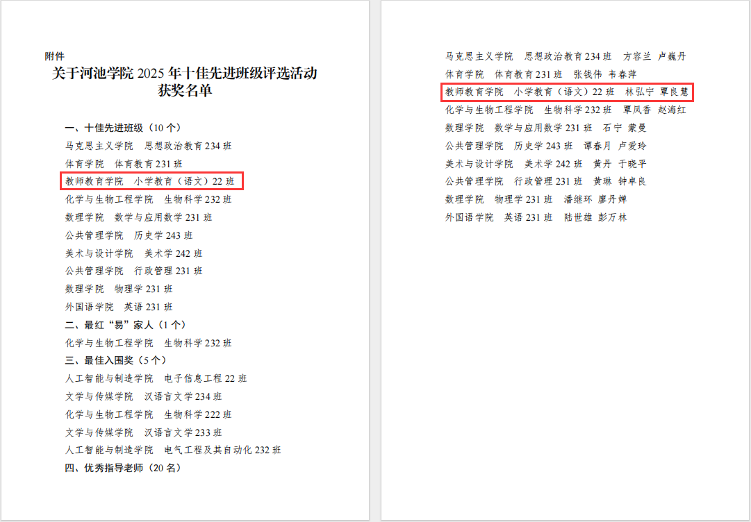 在学校近期组织的“2025年十佳先进班级评选活动”中,经过学院推荐、评委综合评审、易班网页投票及展演答辩等多个环节的激烈角逐,我院小语22班脱颖而出,荣获“十佳先进班级”荣誉称号,林弘宁、覃良慧老师获“优秀指导老师”荣誉称号。