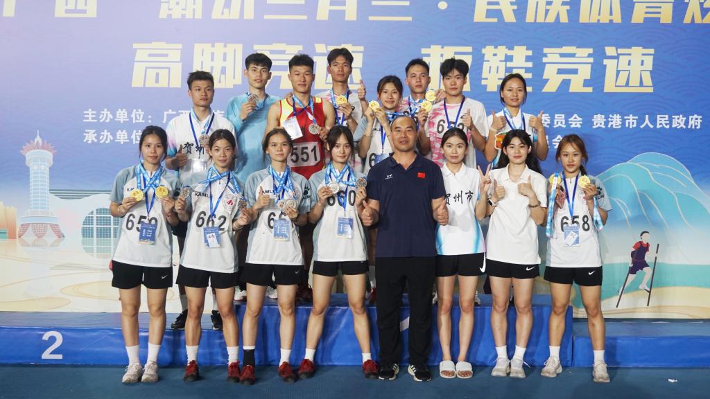 2025年4月19日至20日广西“潮动三月三•民族体育炫”系列比赛在贵港市举办。本次比赛汇聚了全区14个市、多所高校以及云南、贵州、福建等省份的顶尖选手,竞争异常激烈。我校代表河池市、贵港市以及贺州市参加独竹漂、板鞋竞速、高脚竞速等项目比赛,在比赛中以绝对实力震撼全场,在这场民族体育盛会上大放异彩,斩获11项一等奖、16项二等奖、18项三等奖,用汗水与拼搏书写了属于我们的荣耀篇章!在板鞋竞速项目中,我校13名健儿与全区159名顶尖选手同台竞技。经过两天的激烈角逐,我校女子组展现王者风范,以无可匹敌的速度与默契,包揽60米、100米、200米及2×100米接力4项冠军!男子组同样表现不俗,再添1项一等奖,最终以5金3银2铜的辉煌战绩傲视群雄。高脚竞速赛场上共有16支代表队88名运动员展开激烈比拼。我校新组建的高脚竞速代表队在女子400米和2×100米接力项目中夺得2项三等奖。最令人振奋的当数独竹漂项目,我校运动员展现的娴熟技巧与稳定性,包揽6个比赛项目的一等奖。此外,还斩获12项二等奖、13项三等奖,是当之无愧的“梦之队”!