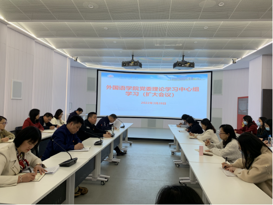 2022年3月28日下午,外国语学院(国际教育学院)在实训楼多功能厅召开党委理论中心组学习扩大会议,学院党委覃春华主持并讲话,全体教职工党员参加会议。会议的主题为贯彻“两个确立”,做到“两个维护”。