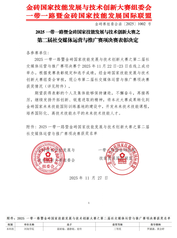 近日,2025“一带一路”暨金砖国家技能发展与技术创新大赛第二届社交媒体运营与推广赛项全国总决赛(本科组)圆满落幕。外国语学院商务英语专业2023级蓝尉瑜、潘静妮、麦玲组成的参赛团队,在罗潇潇、黄会婷两位指导教师的指导下,凭借过硬的专业素养和出色的实战能力,从全国50支参赛队伍中脱颖而出,以排名第20的好成绩成功斩获三等奖。