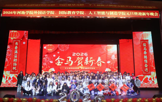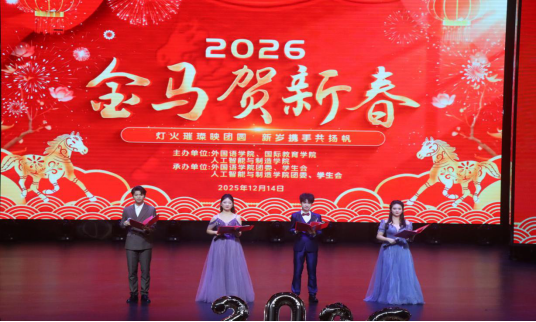 为迎接元旦佳节,搭建跨学科交流平台,展现学子青春风采,12月14日晚,外国语学院、国际教育学院与人工智能与制造学院联合主办的2026年“金马贺新春”元旦晚会在东区艺术楼演播厅圆满举行。学院领导、师生代表欢聚一堂,共赏视听盛宴,喜迎新年到来。