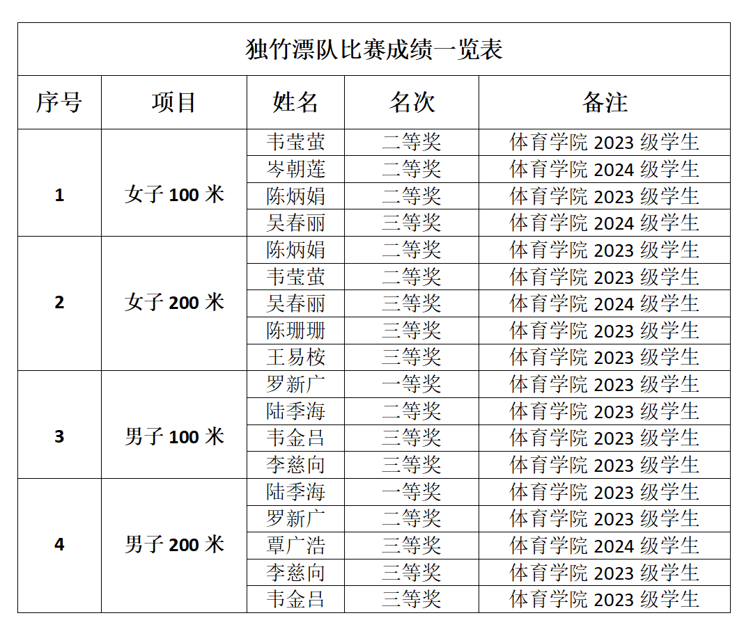 经过两天激烈角逐,我校12 名运动员中有 11人成功跻身比赛前八名,共收获2个一等奖、7个二等奖、9个三等奖。值得一提的是,陆季海夺得男子200 米项目一等奖,罗新广夺得男子100米项目一等奖,两位同学成为本次比赛中涌现出的新全国冠军。这一优异成绩,是继 2024年第十二届全国少数民族运动会之后,我校在独竹漂项目人才培养上取得的又一成果,也充分展现了我校在该项目上持续保持的全国领先地位。