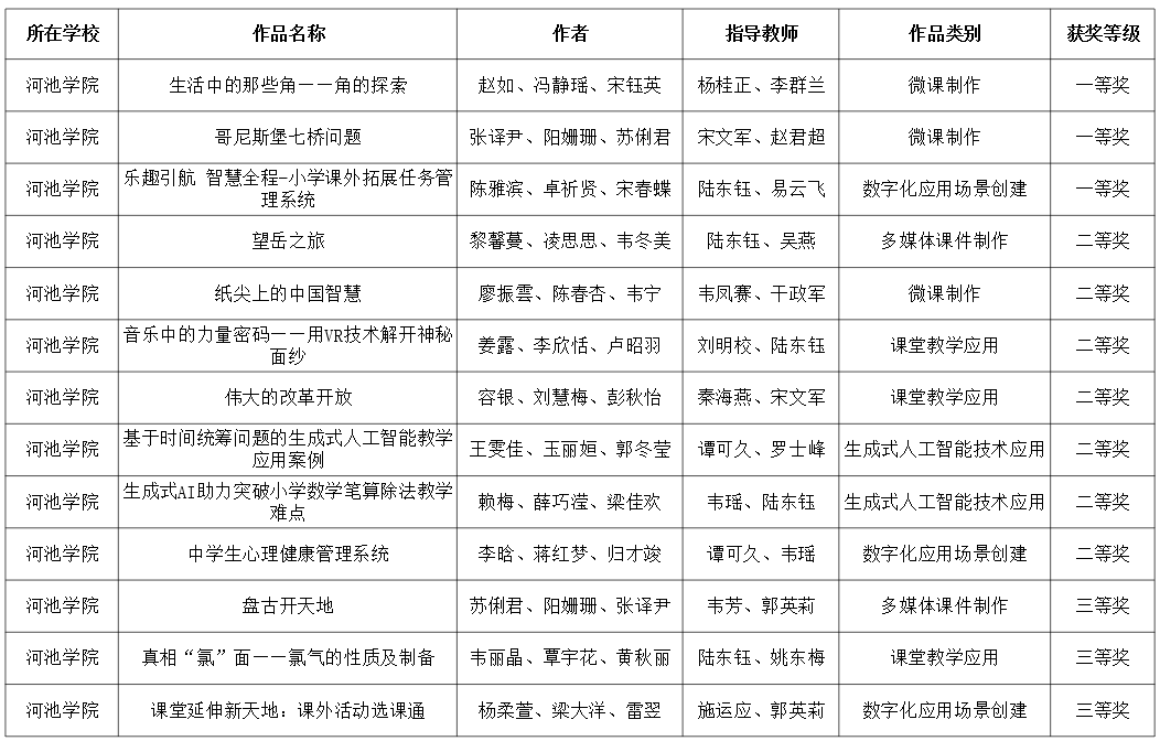 近日,广西壮族自治区教育厅公布了2025年全区师范生信息化教学应用大赛获奖名单,我校学子凭借扎实的专业素养、创新的教学思维和精湛的信息化技术应用能力取得了优异成绩,选送15个作品在多媒体课件制作、微课制作、课堂教学应用、生成式人工智能技术应用、数字化场景创建5个赛项上一共斩获13个奖项,其中一等奖3项、二等奖7项、三等奖3项,在全区同类同级高校中排名前列,充分展现了我校师范生“以赛促教、以技赋能”的实践精神。