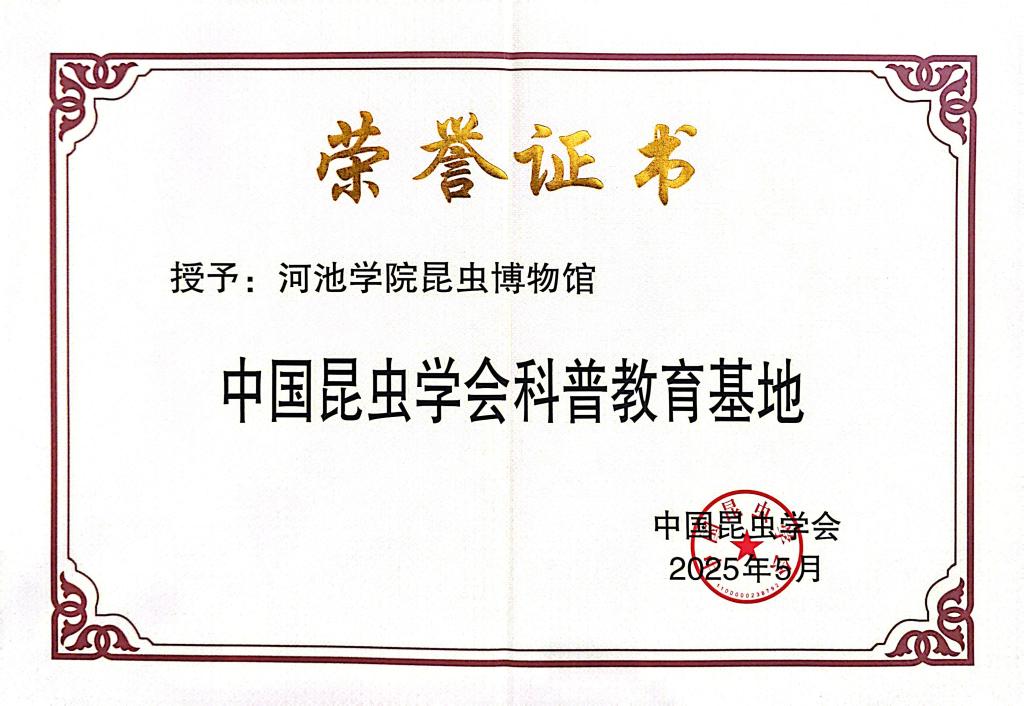8月23日,河池学院昆虫博物馆(河池学院动植物与蚕桑科技馆)凭借其在科普教育领域的突出贡献,成功通过中国昆虫学会的严格评审,荣获“中国昆虫学会科普教育基地”称号。这是该馆自成立以来首次获得国家级荣誉称号,标志着其科普工作向前迈出了重要的一步。