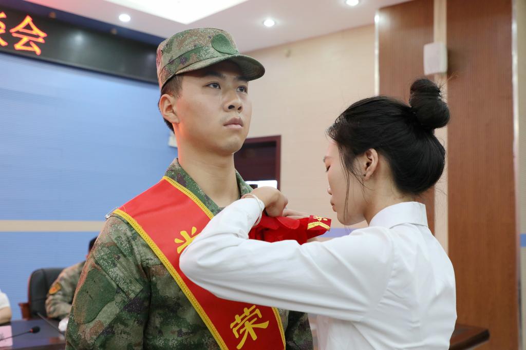 会上,学校人民武装部部长梁达友介绍学校2025年秋季征兵工作情况并为入伍新兵颁发入伍通知书。学生代表为入伍新兵佩戴红花。