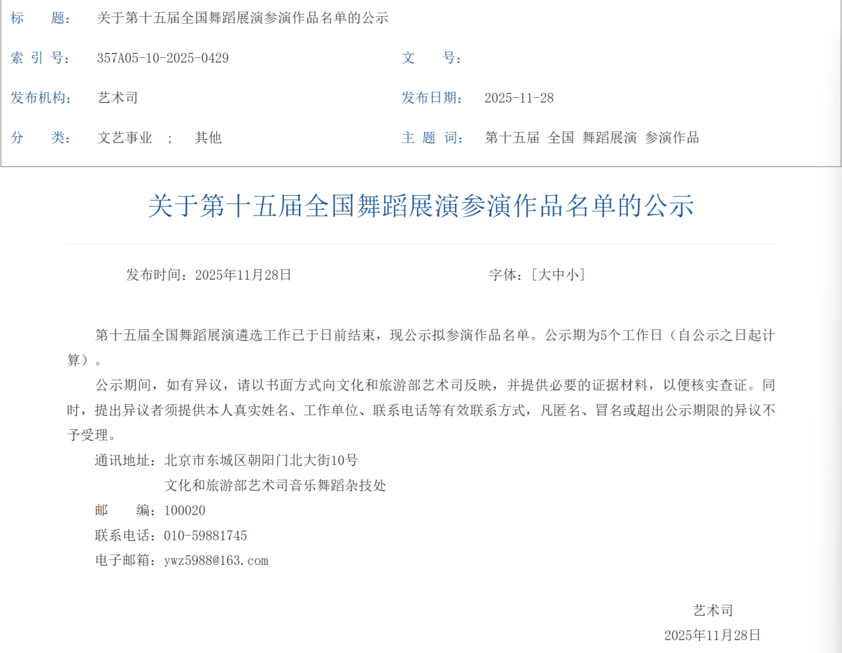 全国舞蹈展演创办于1980年,每三年举办一届,是文化和旅游部(原文化部)主办的全国舞蹈艺术领域规格最高、影响最广、水准最佳的艺术盛会。近四十年来,展演推出了大批优秀舞蹈作品与杰出人才,有力推动了中国舞蹈艺术的创作交流与繁荣发展。第十五届全国舞蹈展演由文化和旅游部、江苏省人民政府共同主办,将于12月10日-26日在江苏无锡集中展演。