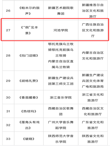 近日,文化和旅游部艺术司正式公示第十五届全国舞蹈展演参演作品名单。由广西壮族自治区文化和旅游厅推送、河池学院音乐舞蹈学院创演的群舞《“侗”见丰景》成功入选,成为本次广西唯一入围的群舞作品。
