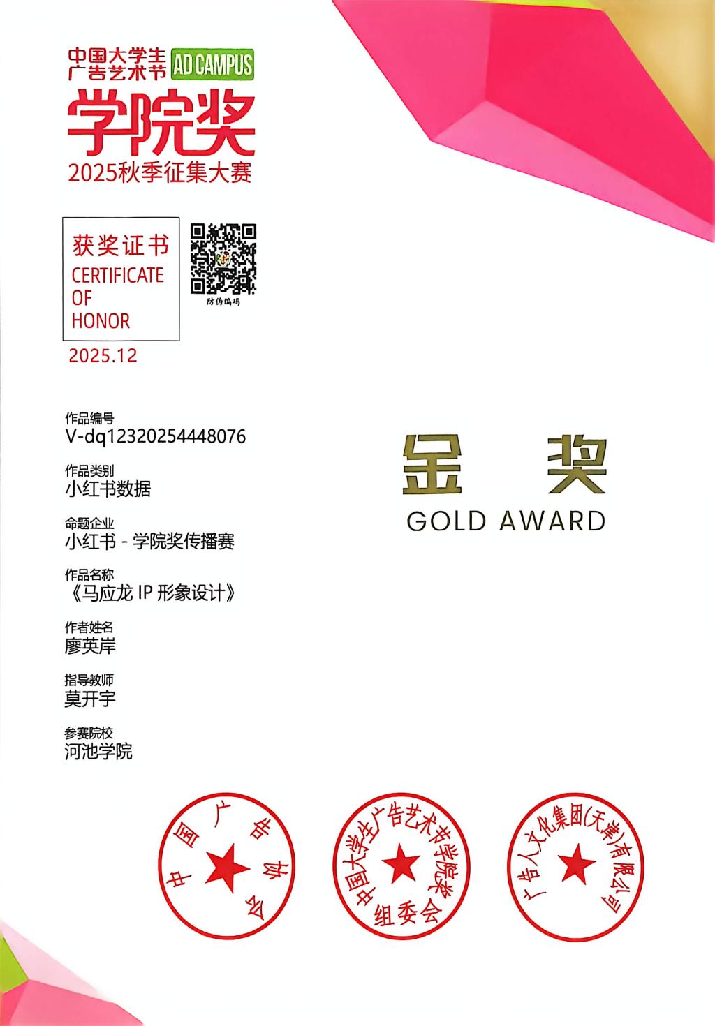 2025年12月28至29日,中国大学生广告艺术节学院奖2025秋季征集大赛·青春盛典在北京广播大厦演播厅举行。美设学院视传231廖英岸同学荣获金奖2项、一等奖2项、三等奖1项,传播类中三个命题分别获第二名、第四名、第五名。