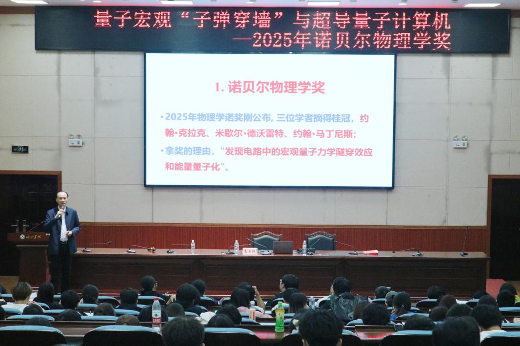 10月31日,银龄教师高英俊教授在弘毅楼1-205报告厅,为数理学院物理系师生作题为“量子宏观‘子弹穿墙’与超导量子计算机”学术讲座。讲座紧扣2025年诺贝尔物理学奖核心成果,系统解读宏观量子效应与超导量子计算前沿知识。讲座由学院副院长尹向宝主持。