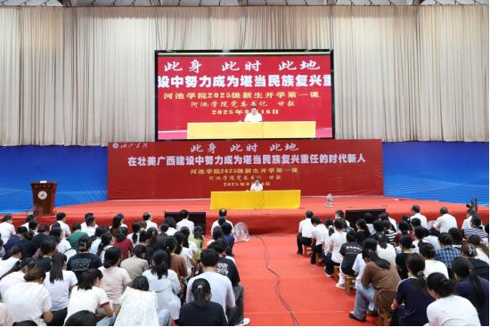 9月16日上午,河池学院在体育馆隆重举行2025级新生开学典礼暨“开学第一课”。校党委书记甘毅以“此身、此时、此地,在壮美广西建设中努力成为堪当民族复兴重任的时代新人”为题,为全体新生讲授了一堂深刻而富有感召力的“大学第一课”。